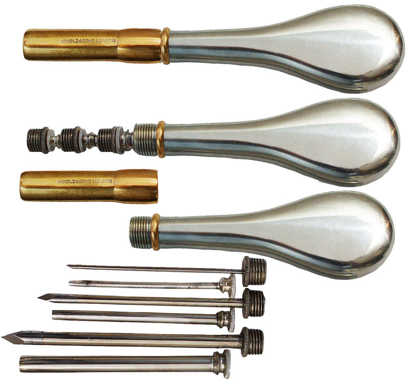 A 19th Century Trocar And Cannula Set By Arnold & Sons London. The trocar was used to drain fluids collected in the body and was used until the invention of diuretics. The trocar, with the cannula pipe covering it, was plunged into the chest or abdomen. The trocar was then removed and the fluid drained through the cannula. This late 19th century set, made by Arnold and Sons in London has 3 different size nickel plated steel trocars and silver cannnulas all fitting together inside their brass canister.