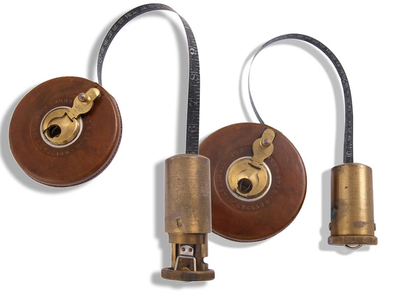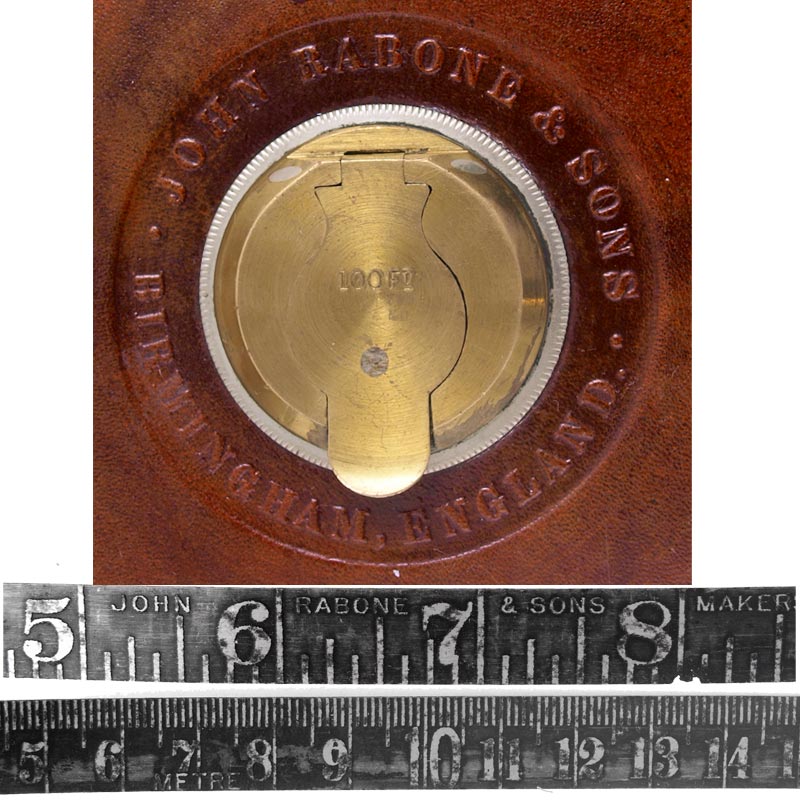 An extremely rare steel tape measure in a hard leather case with plumb bob. The tape measures up to 100 ft and 30 m on the reverse side. The plumb bob unscrews at the bottom allowing the tape measure to be slotted in and attached via the tape’s ring. By re-screwing the plumb bob, the tape is held fast thus enabling it to be suspended over an edge or rim to evaluate the height or depth of well or any liquid. Both tape and plumb bob are marked John Rabone & Sons Birmingham England. The plumb bob also says Pat. No. 356370. The plum bob alone, weighs 860 gr. Michael Rabone founded his Birmingham firm in 1784and called it Hockley Abbey Works. In 1830s John Rabone (Michael’s son) took over the company. In 1845 his son John Jr joined and the company changed its name to John Rabone and Son. In 1877 the name was changed to ‘John Rabone & Sons’ when John Junior’s sons entered the firm.