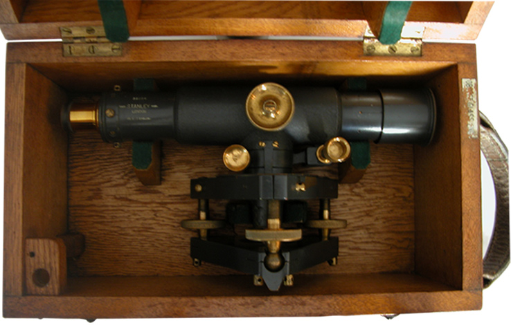 A precision level is a measuring instrument, used together with a measuring staff, to gauge the exact differences between the levels of two or more positions on the ground. The level has two main parts: the tribrach and the telescope. The tribrach has 3 foot screws which can be rotated to allow the telescope to give the required horizontal line-of-sight. The tribrach also has a vertical axis, around which the telescope may be rotated to sight the measuring staff. On the telescope is a level so that accuracy in leveling will be possible. The telescope may be tilted gently (up and down) by turning a "tilting screw" which is located between the telescope and the base. This tilting screw helps level the telescope before each staff reading. This engineer’s level has a 30 cm (12") telescope with internal auxiliary lens to permit focusing without changing the overall length and preserving the balance of the telescope. The level is signed on its side Stanley London Made in England. The original wood box also is also signed in the lid WF Stanley & Co LTD. 286 high Holborn London WC1. The level and box are heavy; therefore special shipping rates apply to this item