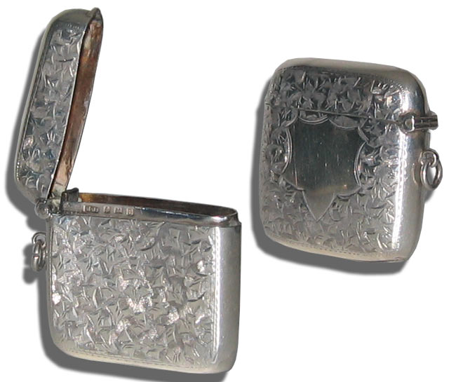 A square silver match-safe/ vesta case with engraved foliate decorations and an empty shield cartouche in the center. The lid is snap hinged, and the case has attached bail on the side. The ridges on surface for stiking the matches are bold and have, little, to no wear. The hallmarks are stamped on inside lip: The lion passant for sterling silver, the anchor for Birmingham, the letter n for 1912 and RBS for the Robinson Brothers silversmiths.