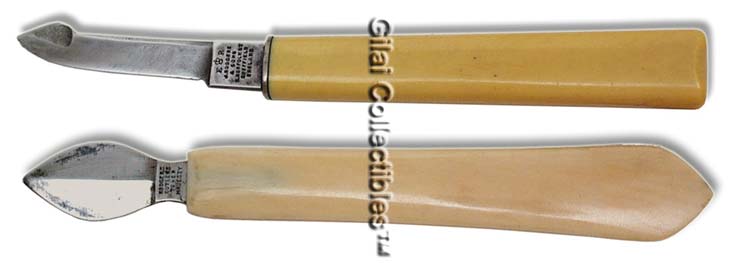 These are late19th century implements. The eraser was used for scraping and removing ink or pencil lines without damaging the surface of the paper. It is made of steel with a short double bladed leaf-shaped knife and an ivory handle. It measures 13 cm (5.1 inches). The quill knife was used for cutting the edge of quills, in order to sharpen them for writing. The knife measures 13.5 cm (5.2 inches). The handle is yellow celluloid. Both instruments were made by J. Rogers & Sons of Sheffield England, appointed cutlers to His Majesty King George IV in 1821. The quill knife is also marked with ER, which dates it to King Edward VII (reigned 1901-1910).