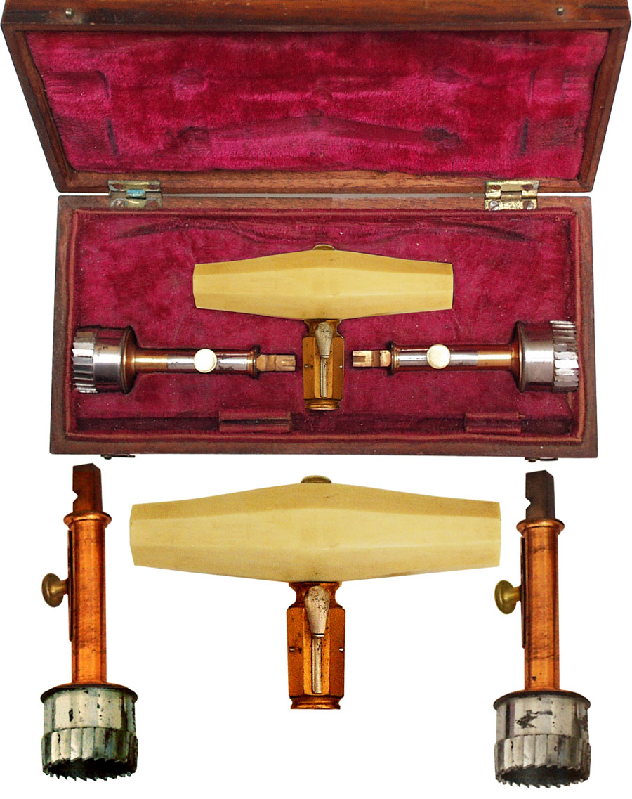An Early 19th Century Gilt Brass, Steel And Ivory Trepanning Set. This neurosurgical set consisting of a heavy ivory octagonal section handle with push button lock and two interchangeable crown trephine cutters for drilling holes in the skull. All are fitted in a plush lined mahogany case. The case 19 cm (7inch) wide.