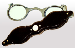 The case was made from riveted ebony wood with mother of pearl inlay. The frame with simple bridge was made from German silver with oval lenses.This is an Adams Style Lorgnette made in England under the name ‘Pocket Spectacles’. Invented by George Adams Jr. (1750 – 1795) in the form of a penknife and intended to be carried loose in the pocket. Provenance: From the Orr collection Inventory No. 77. Hugh Orr (1905 - 2002) was a collector and curator of the British Optical Association Museum. In 1985 he published the book ‘Illustrated History of Antique Spectacles’.