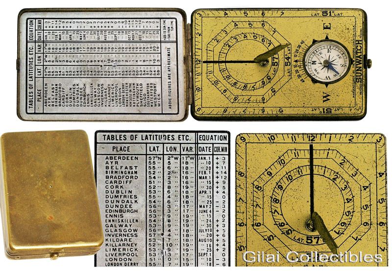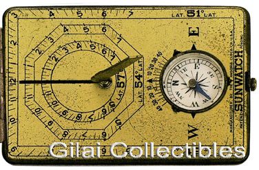 ‘Sunwatch’, A Combination Sundial and Compass by Ansonia Clock Co. Sunwatch is a sundial that was carried when a pocket watch would have been too expensive. This brass pocket sundial was made by the Ansonia Clock Company USA, for the British market in the early 1920’s. The sundial base plate has 3 scales for telling time in 3 places with different latitudes. The inside cover has a chart listing 33 cities in Great Britain and their respective degrees latitude, longitude and clock time in minutes to add or subtract from sun time. The brass gnomon is fitted into a crevice in the base plate, to be pulled out when needed. The various latitudes are etched into the base of the gnomon for easy use. The Sunwatch is enclosed in a brass case with a push-button catch at the base.