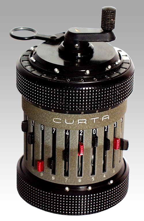 Curta Type II Mechanical Calculator. This Type II model with serial number 520286 was manufactured on November 1958 and was made in Liechtenstein by Contina Ltd. (invented by Curt Herzstark). All of the mechanical and other parts are functioning very well, including: The main operating handle that can be pulled up or down. The carriage drum that could be raised and turned. The setting knobs that are used for selecting any number from 1 – 9. The counting dials that shows the results and the counter position. The clearing lever that by rotation can clear the dials. The reversing lever with its two working positions. The special plastic shock-resistant carrying case, which opened with a clockwise twist.